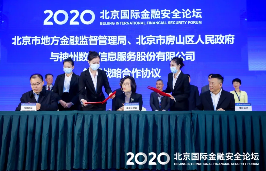 论坛开幕式上,北京市地方金融监督管理局、北京市房山区人民政府、神州信息达成战略合作。房山区委副书记,区政府党组书记、区长郭延红;北京市地方金融监督管理局二级巡视员邹世斌;神州信息董事长郭为,分别代表三方签署合作协议,将围绕在数字经济场景应用、金融新基建、金融安全、人才培养等方面展开全方位合作。未来,神州信息通过整合自身金融安全能力,将打造集行政总部、生产、研发、测试、培训等为一体,具有国际影响力、国内顶尖的中国金融安全基地,立足北京,辐射全国,共同扎牢我国金融行业的安全线。北京市政府副秘书长张劲松;中国互联网金融协会会长李东荣;中国网络空间研究院副院长、中国网络空间安全协会秘书长李欲晓;国家金融与发展实验室理事长李扬;北京金融科技研究院院长谢平;《金融时报》社长邢早忠;清华大学金融科技研究院副院长张晓燕作为见签嘉宾,共同见证签约。