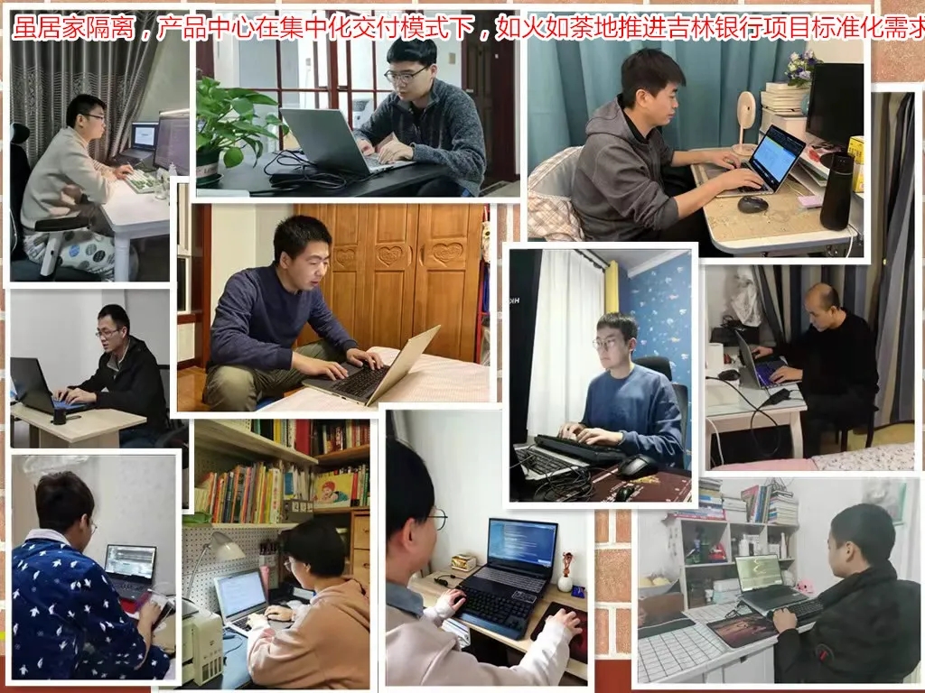 居家办公期间,银行核心基地开发团队克服疫情不利影响,持续按照既定计划稳步推进工作事项。虽然没有在同一个工作场所,但是在各自家中不论书桌前还是餐桌旁,大家的目标是一致的,肩上的责任不变,工作的激情不变,创新的精神不变!