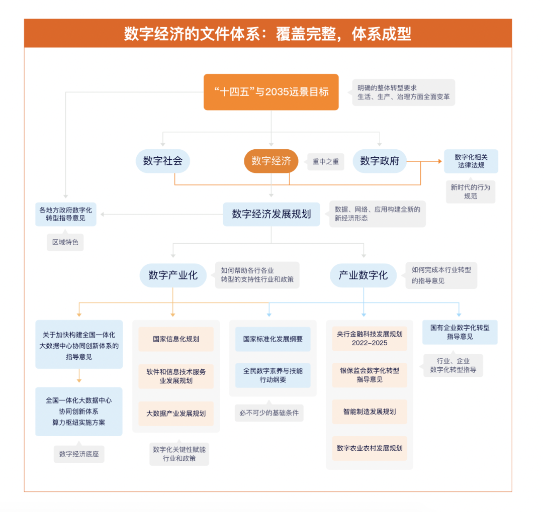 以《中华人民共和国国民经济和社会发展第十四个五年规划和 2035 年远景目标纲要》和《“十四五”数字经济发展规划》这两个文件为核心,加上更具有区域特色的地方政府文件和作为新时代行为规范的法律法规,逐渐形成了数字化转型指导文件体系。从中央到地方的数字化蓝图是日渐清晰的,资源和行动会更加聚焦。