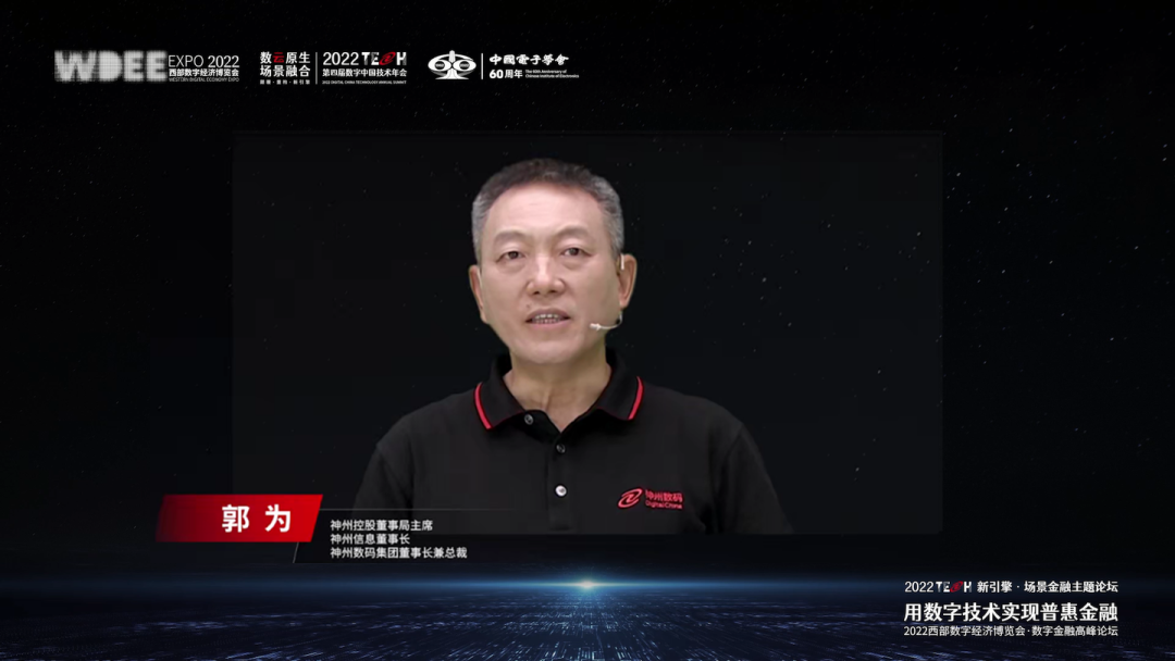 作为联合承办方,神州控股董事局主席、神州信息董事长、神州数码集团董事长兼总裁郭为发表“数字化的力量”主题致辞,分享了他对数字经济时代金融业变革的思考。郭为谈到,神州信息是中国最早从事银行信息化建设的科技企业,伴随了中国银行业整个数字化进程。进入数字化时代,银行的数字化目标也发生了根本性的变化,即面向投资人、股东实现资产规模最大化,面向客户提供服务便利性,自身如何基于新的IT架构实现业务敏捷化,场景金融将是实现这些目标的重要手段。基于数云融合,神州信息发布了场景产品化的创新性银行架构ModelB@nk 5.0,一是为客户提供订阅式、点播式的金融服务,二是帮助银行实现内部管理的高效、积累更多数据资产,同时打造了信创全家桶“神州信创云”助力筑牢金融安全。未来,神州信息希望有更多机会与政府、客户及同业伙伴,共同探讨,为中国金融数字化转型贡献力量。