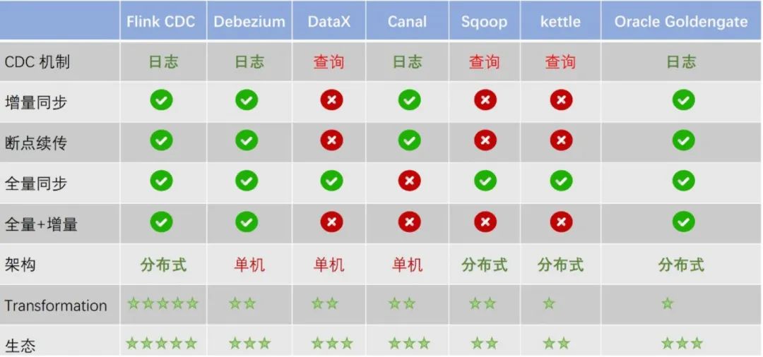 (2) 在全量+增量一体化同步方面,只有Flink CDC、Debezium、Oracle Goldengate 支持较好。