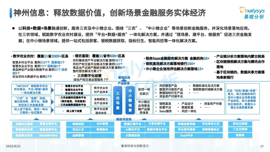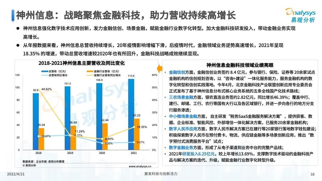 近日,易观分析发布的《中国数字科技专题分析2022》公布了“2021年度数字科技创新型企业TOP50”榜单,神州信息继2020年榜单后再度入选。