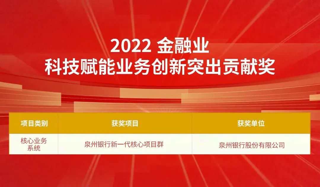 由神州信息参与建设的“秦皇岛银行新一代分布式核心系统建设项目”和“泉州银行新一代核心项目群”分别获评“2022金融业数字化转型突出贡献奖”和“2022金融业科技赋能业务创新突出贡献奖”。